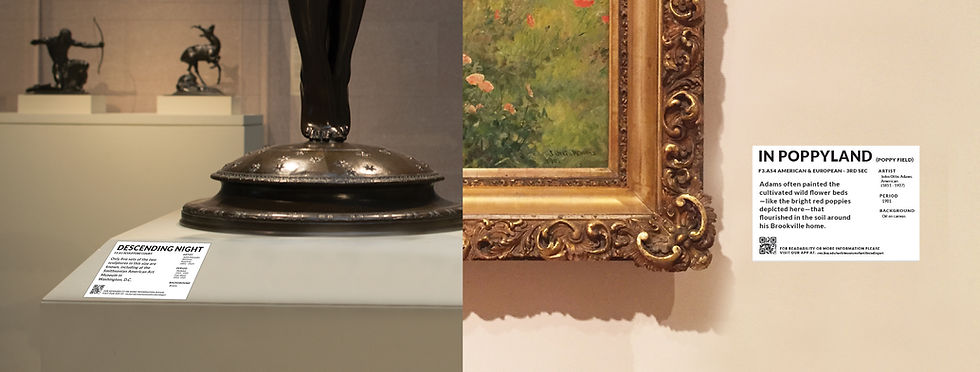 The main goal within this design solution is to create a design that creates an optimal level of readability. To achieve this I created a solid foundation and organized information through hierarchy and spacing . A layout with an adequate amount of white space to eliminate overwhelming and clustered information as well as limited text. Large, bold, sans serif font to increase readability both through style and contrast. The colors‘ contrast levels cleared the triple A readability test. A 21st century technology option for special artworks that has additional qualities such as language, font, and contrast adjust-ability; as well as a glare free - like ink on paper experience with lighting that is easy on your eyes. Three-Dimensional prototypes for sculptures and three-dimensional replicas of 2D artwork is provided to give the low vision audience an more clear internal visualization of the artwork through their sense of touch.