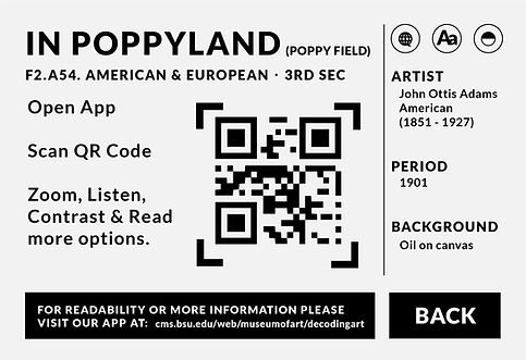 This app allows navigation through the entire museums’ artworks with zooming, read aloud, and contrast capabilities, located at the top of every page to eliminate unnecessary switching to and from the home/settings to change preferences constantly. The app offers language and font settings that are changeable. The most important characteristic however, is the QR code where you can scan any QR Code on artwork labels and it will take you directly to that specified artwork without thorough navigation of the entire app. It is also stylized according to the ADA and Smithsonian guidelines, as well as acquiring consistency to the label solution to create a sense of predictability and ease for the user.