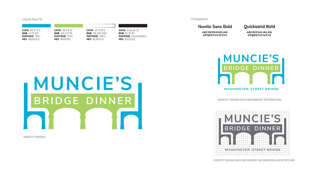 Muncie's Bridge Dinner is a community-strengthening event. Since the event was being organized on Washington Street Bridge in Muncie, Indiana, we decided to use the bridge silhouette as a dinner table around which the people congregated for an evening dinner. The chairs represent the diverse population that was in attendance to be a part of this community event.